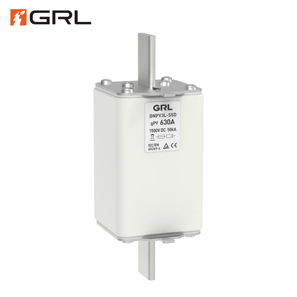 The GRL DNPV3L-S5D series solar fuse link represents the highest capacity class of high-speed DC circuit protection for photovoltaic systems. Rated for 1500V DC and accommodating substantial currents from 250A up to 630A, this photovoltaic fuse link is engineered for critical protection of centralized photovoltaic inverters and major array disconnects in large utility-scale solar parks. The ‘D’ designation signifies a robust knife-type contactor for secure, high-contact-pressure plug-in mounting.